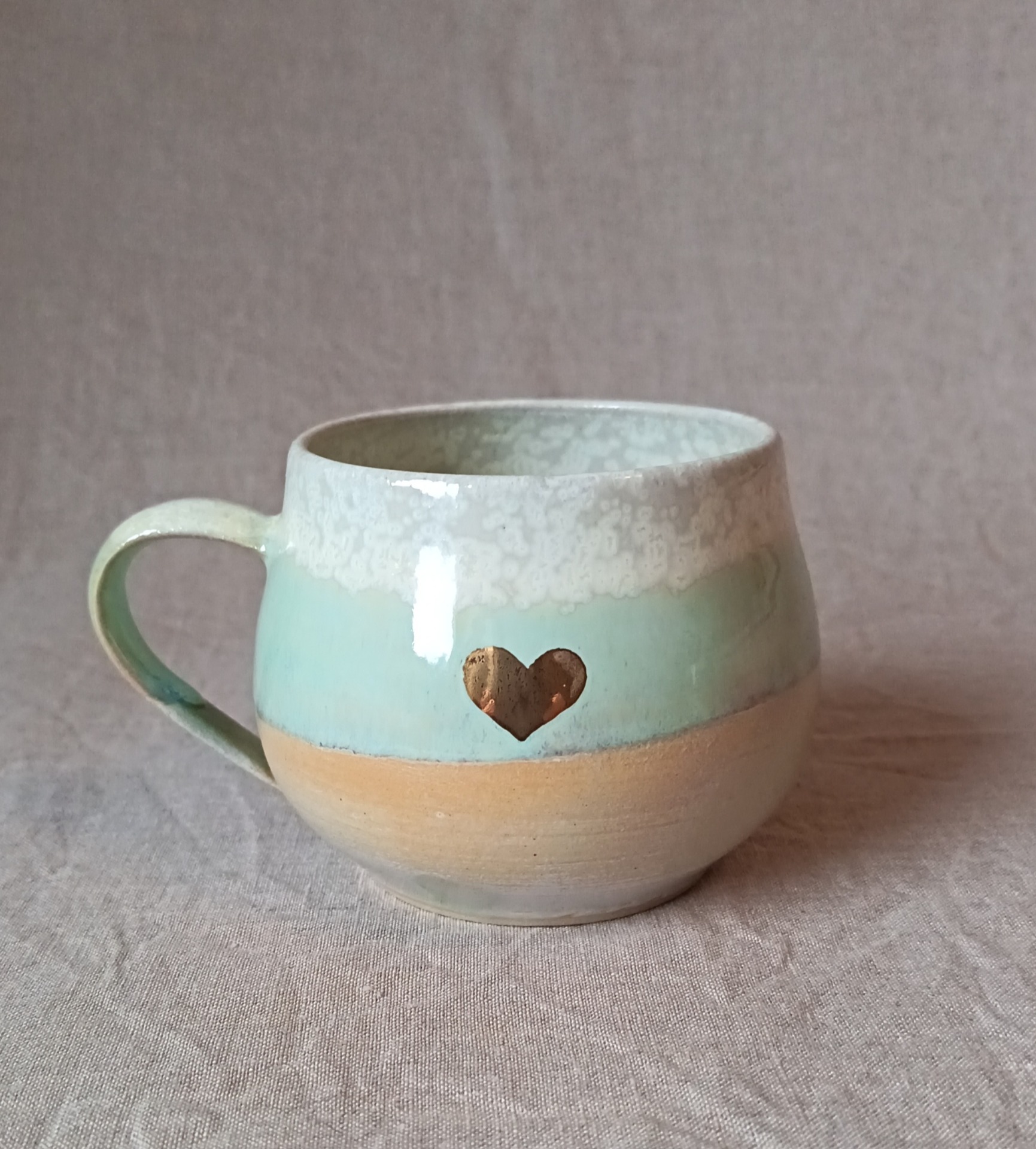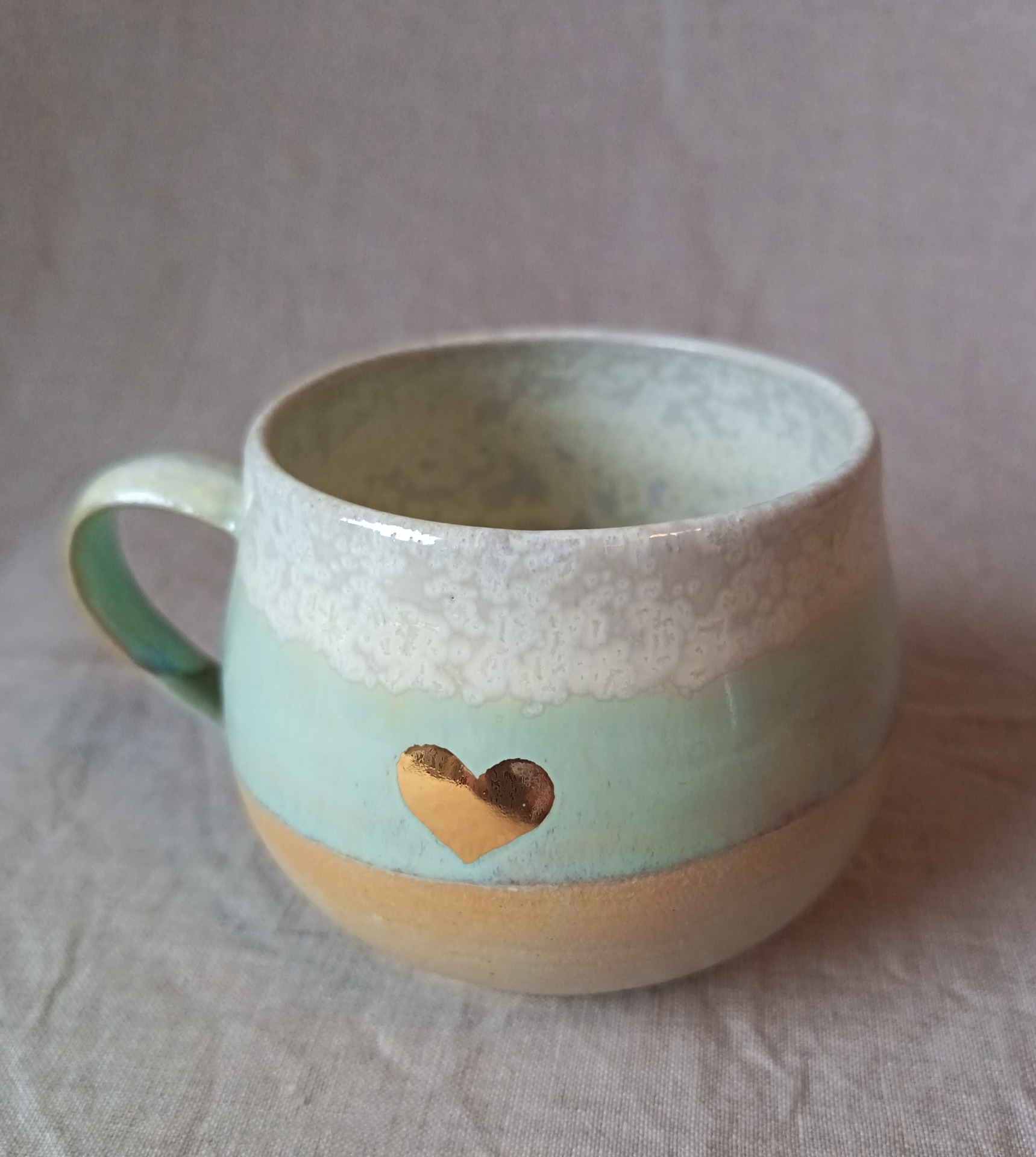 Kopp i steingodsleire. (Gullhjertet inneholder 14 karat gull). Håndddreid og dekorert.