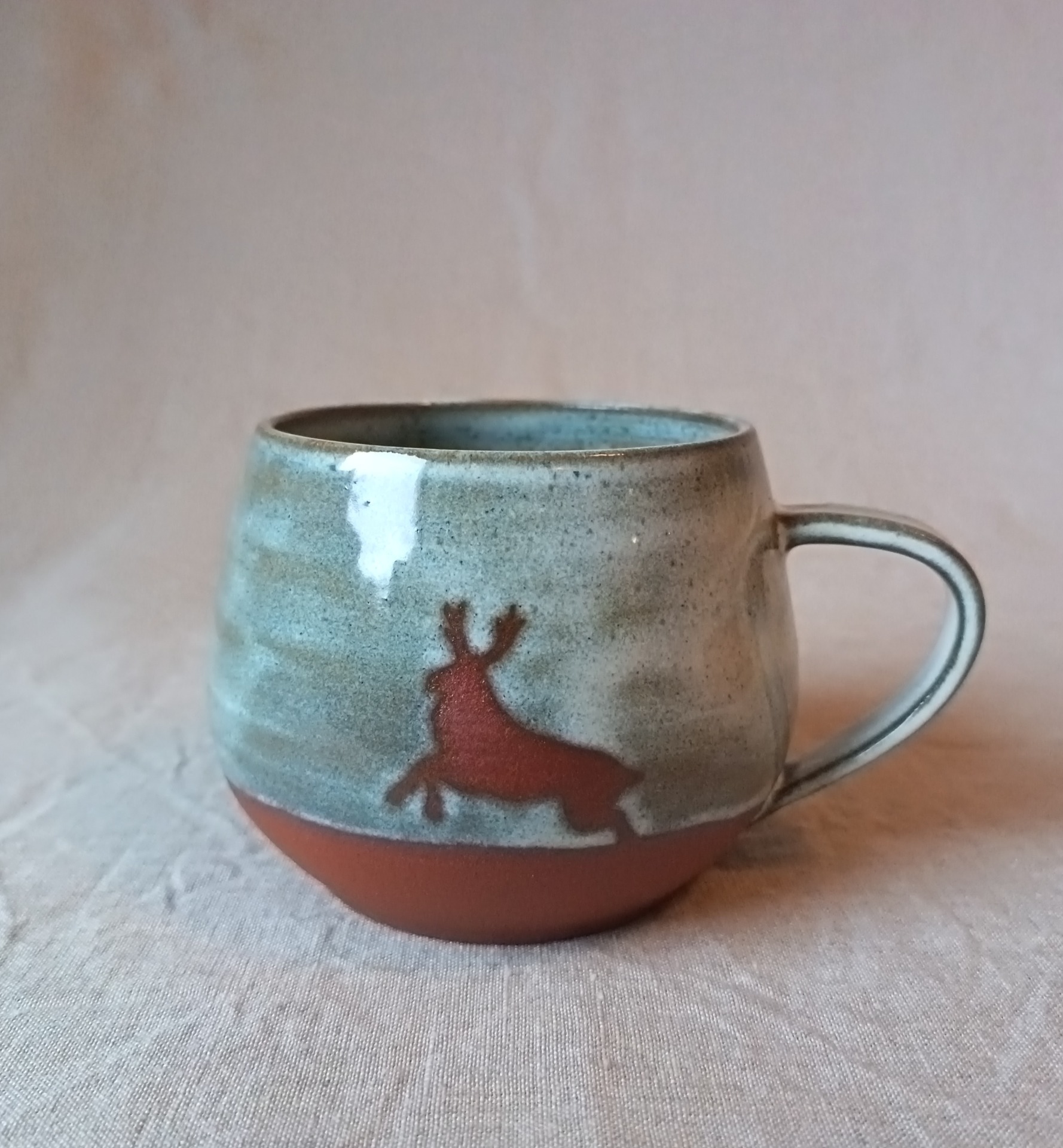 Kopp i brun steingodsleire. Melert grå glasur. Håndddreid og dekorert.