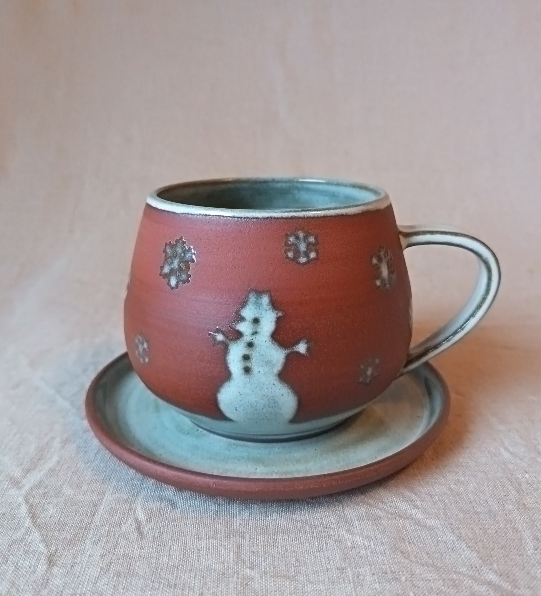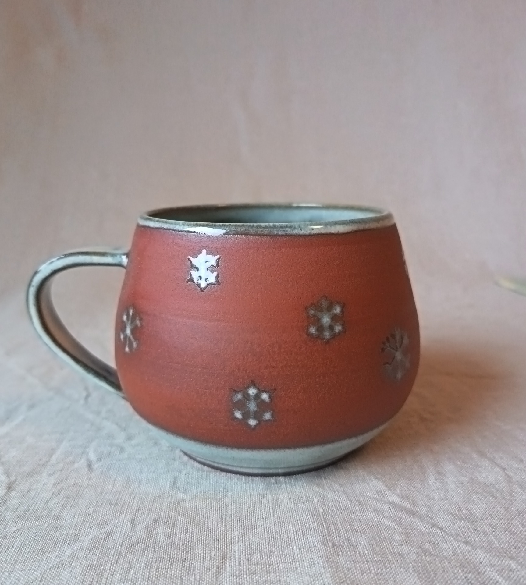 Kopp i brun steingodsleire. Melert grå glasur. Håndddreid og dekorert.