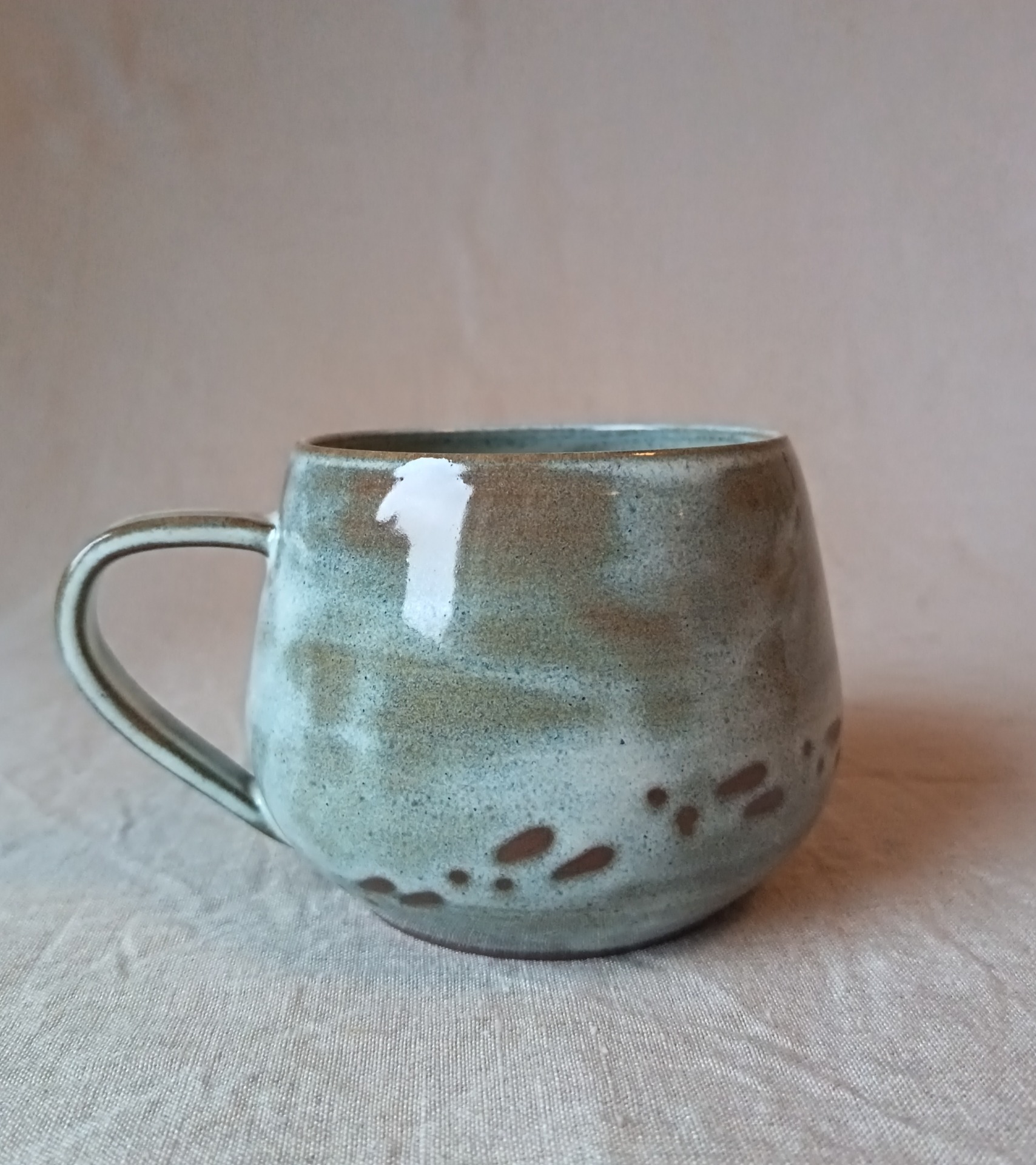 Kopp i brun steingodsleire. Melert grå glasur.