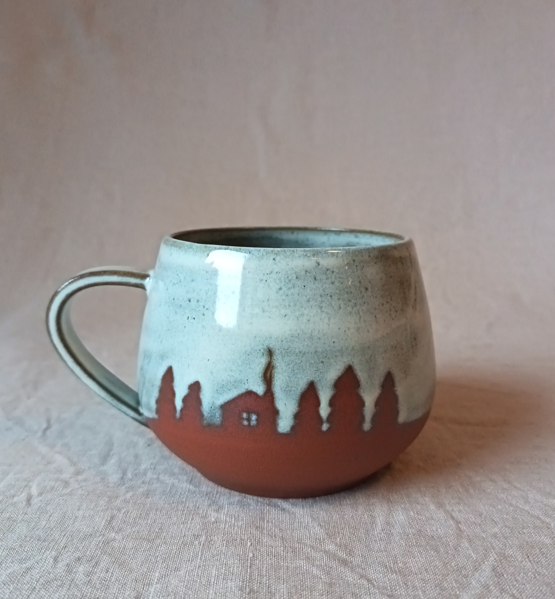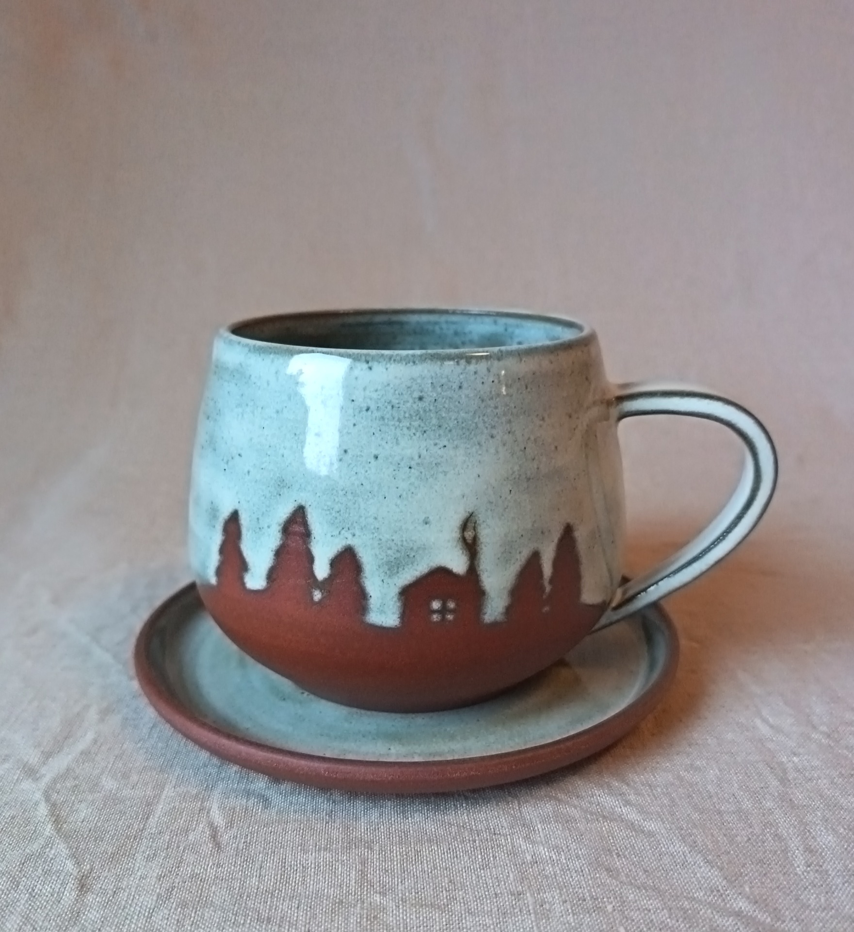 Kopp i brun steingodsleire. Melert grå glasur.